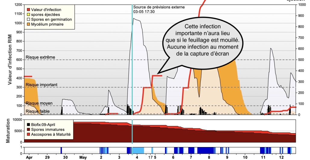 Plusieurs localités ont enregistré aujourd’hui de courtes périodes de pluies très favorables à l’éjection des ascospores de Venturia inaequalis. Ces spores doivent germer sur du feuillage mouillé pour causer une infection. Le “nuage blanc” sur l’image jointe représente cette germination. Dans la plupart des cas, l’infection n’aura pas lieu parce que la période d’humectation du feuillage sera trop courte. Les stations ne représentent pas toujours précisément les conditions météorologiques de votre verger alors il est utile de confirmer visuellement que le feuillage était effectivement sec avant que le cumul de mouillure ne permette l’infection. Dans les rares cas où le risque (ligne rouge RIM) apparait dans les prévisions (à droite de la ligne turquoise), il est aussi utile de considérer l’importance du risque avant d’intervenir à nouveau. Dans les vergers propres ou dans les vergers où un traitement était en place, les risques faibles (<100) ne sont pas alarmants. Mais si l’humectation continue, le risque peut augmenter rapidement (voir image)