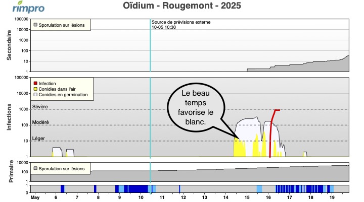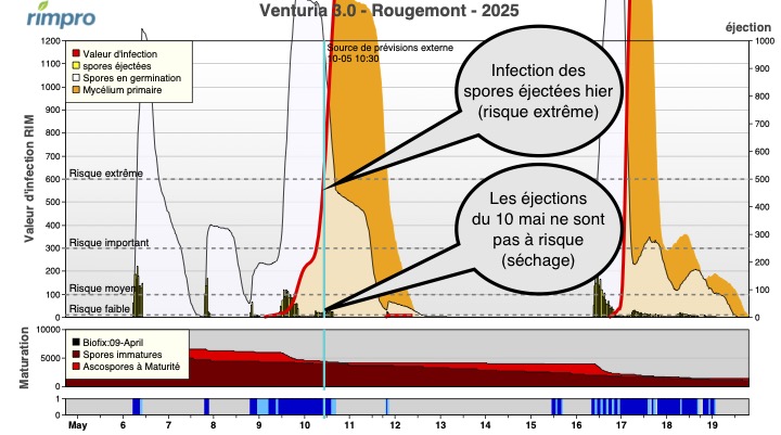 La pluie du vendredi 9 mai a provoqué une éjection très importante (Potentiel RIM > 1000). Au moment d’écrire ce billet (10 mai à 11 h), l’infection de tavelure a déjà dépassé le seuil « extrême » (> 500). Selon le moment où surviendra le séchage des feuilles aujourd’hui, il est possible que le risque atteigne son plein potentiel. La pluie du samedi 10 mai a permis l’infection des spores éjectées hier, mais le séchage empêchera l’infection de celles éjectées aujourd’hui (voir l’image de RIMpro pour Rougemont).