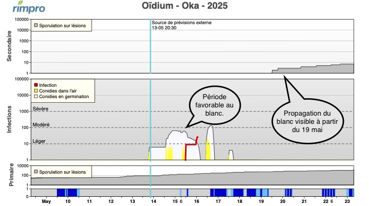 Dans les vergers où le blanc était problématique l’an dernier, la chaleur et l’humidité prévue cette semaine vont certainement favoriser la maladie. (Voir RIMpro). Le modèle identifie bien les périodes de sporulation, mais l’infection n’est pas toujours prédite correctement. N’attendez pas une ligne rouge pour agir.