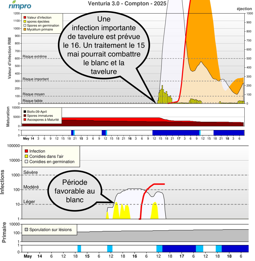 Une intervention avec un produit efficace contre le blanc est à envisager le 14 ou le 15 mai. Selon son positionnement, ce traitement agira également comme première ligne de défense contre l’infection de tavelure prévue pour le vendredi 16 mai. Dans les vergers où le blanc est plus problématique que la tavelure (ex: HoneyCrisp), un traitement le 14 est préférable.