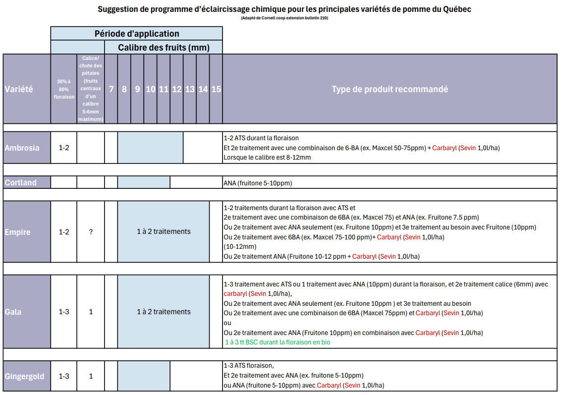Extrait du tableau Suggestion de programme d’éclaircissage chimique pour les principales variétés de pommes du Québec adapté de Cornell University.