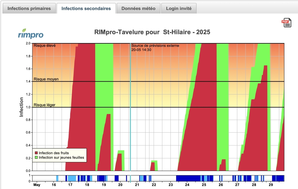 Les observateurs du réseau confirment les prévisions de RIMpro : des taches de tavelure ont été observées cette semaine sur les feuilles de rosette (bouquet), en lien avec l’infection du 26-27 avril. Dans la plupart des régions du sud du Québec, la longue pluie des derniers jours correspond à la dernière infection primaire (ascospores) en l’absence de conidies. Dans les vergers où des taches sont déjà visibles, la sévérité des prochaines infections sera aggravée par la propagation des spores d’été (conidies). Là où aucun symptôme n’est détecté, les prévisions d’infections primaires de RIMpro demeurent pertinentes. En présence de taches, ce sont plutôt les risques d’infection secondaire — également modélisés dans RIMpro — qui deviennent pertinents.