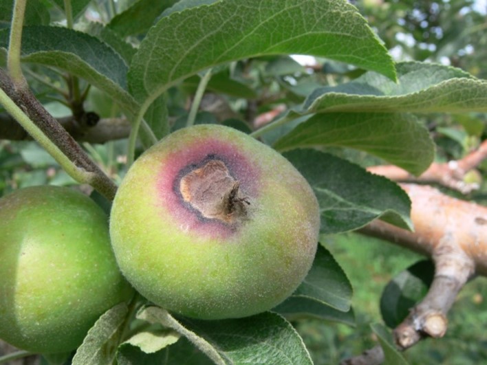 Les fruits infectés deviennent noirs, se momifient et restent attachés aux branches des arbres, même en hiver. Ils sont alors couverts de pustules noirs (pycnides). On rencontre souvent ce phénomène sur le cultivar Cortland.