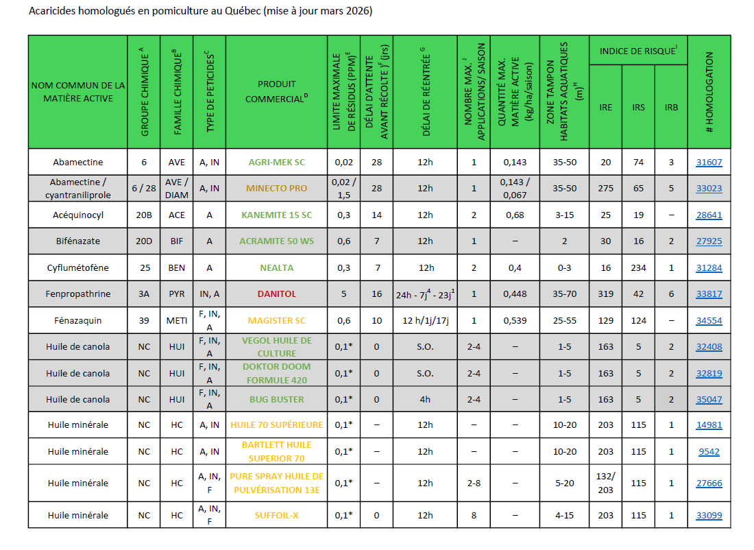 Extrait du tableau acaricides homologués en pomiculture au Québec.
